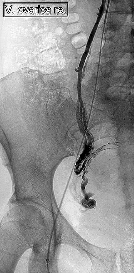 Abbildung 1: Selektive Stufenkatheterunterschung: Kathetergestützte Kontrastmitteldarstellung des venösen Abstromgebietes des rechten Ovars vor der Entnahme einer selektiven Serumprobe zur Hormonwertbestimmung.