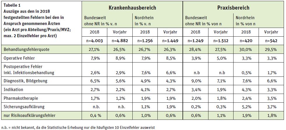 In Nordrhein lag die Behandlungsfehlerquote 2018 bei 32,5 Prozent (n = 1.332) und damit knapp unter dem langjährigen Durchschnitt begründeter Vorwürfe von einem Drittel. Bundesweit betrug die Quote 30,4 Prozent. Während im Krankenhausbereich vor allem operative und postoperative Vorwürfe zur Überprüfung gelangten, werden gegenüber im Praxisbereich tätig gewordenen Ärzten eher Vorwürfe bei der Diagnostik vorgebracht.