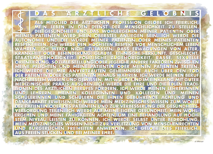 „Als Mitglied der ärztlichen Profession gelobe ich feierlich, mein Leben in den Dienst der Menschlichkeit zu stellen. Die Gesundheit und das Wohlergehen meiner Patientin oder meines Patienten werden mein oberstes Anliegen sein.“ Mit diesen Worten beginnt das Ärztliche Gelöbnis. Es ist die moderne Version des hippokratischen Eids und fasst die ethischen Prinzipien ärztlichen Handelns zusammen. Das Gelöbnis wurde 1948 auf der 2. Generalversammlung des Weltärztebunds noch unter dem Eindruck der medizinischen Menschenversuche während der Naziherrschaft verabschiedet und sollte dazu beitragen, das Vertrauen in die ärztliche Profession wiederherzustellen. Als ethische Leitlinie ist es in der revidierten Fassung von 2017 noch heute den Berufsordnungen der Landesärztekammern vorangestellt.