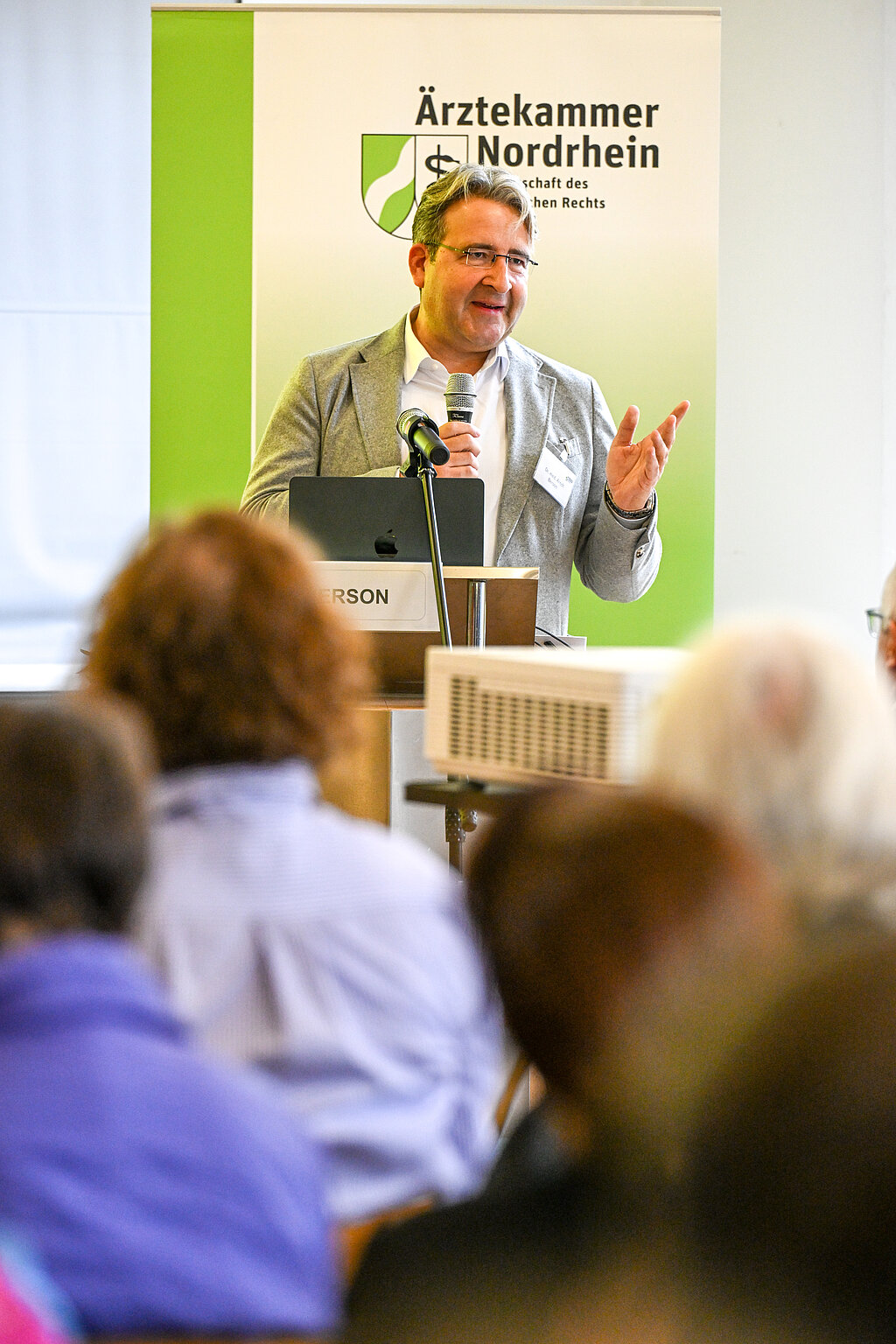 Dr. med. Arndt Berson, Vizepräsident der Ärztekammer Nordrhein und selber Hausarzt, verdeutlichte in seinem Grußwort die Bedeutung geschlechtersensibler Medizin anhand von Beispielen, die ihm aus der eigenen Praxis wohlbekannt seien. Männer und Frauen zeigten teils unterschiedliche Symptome und Krankheitsverläufe – etwa bei Brustschmerz, Migräne oder Depression – was eine angepasste Diagnostik und Behandlung erfordere. Eine geschlechtersensible Forschung und ärztliche Praxis seien zentrale Voraussetzungen für bessere Versorgung und Prävention. Nordrhein-Westfalen sei mit mehreren Initiativen, Instituten und Netzwerken zur Gendermedizin, unter anderem an den Universitäten Witten-Herdecke, Duisburg-Essen und Bonn, in diesem Bereich gut aufgestellt. Berson dankte Dr. Kaup und der Kreisstelle Oberhausen für ihr Engagement und freute sich über die starke Resonanz auf die Veranstaltung.