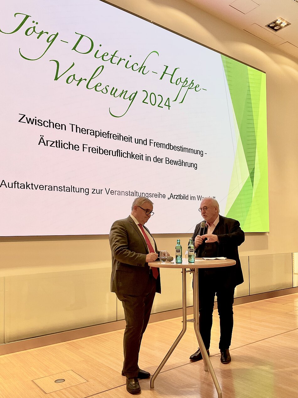 Die diesjährige Jörg-Dietrich-Hoppe-Vorlesung war der Auftakt zu der Veranstaltungsreihe „Arztbild im Wandel“. Untersucht werden soll hierbei insbesondere, wie sich neuere Entwicklungen wie KI, Digitalisierung, Ökonomisierung, Delegation und Substitution ärztlicher Leistungen, aber auch die vielfach geforderte Liberalisierung von Suizidassistenz und Reproduktionsmedizin auf das Selbstverständnis ärztlicher Berufsausübung auswirken und das Bild des Arztes in der Öffentlichkeit verändern werden.